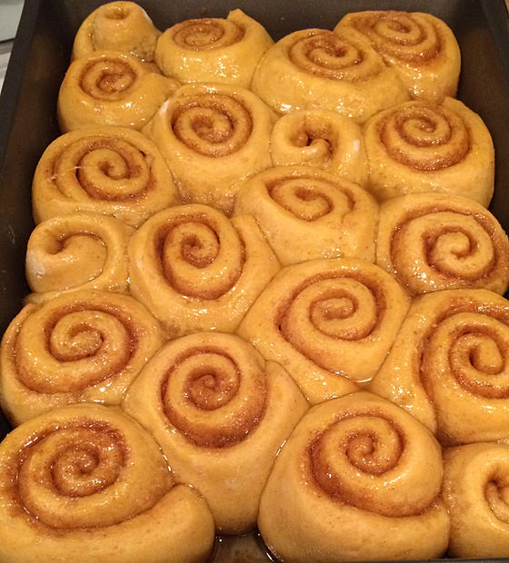 Once the dough has risen, cut it in half, and roll each half out to about a 9×13 rectangle. Divide cinnamon sugar paste in half, and spread out into an even layer on the dough. Roll the dough into a log, and cut each log into 10 pieces. Place cinnamon rolls in a parchment paper lined and oiled 10×15” cake pan, evenly distributing them, and cover with a slightly damp towel. Let rise 1 hour.