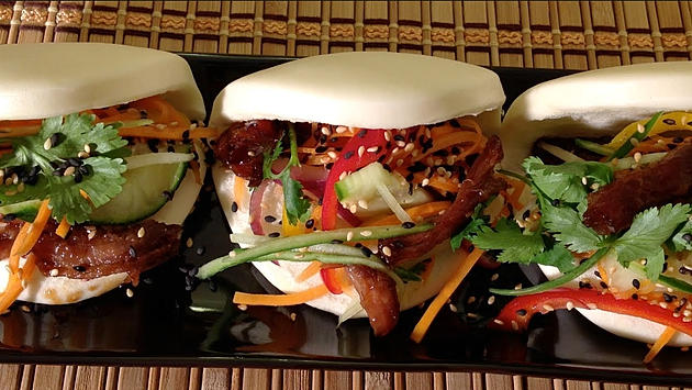 To assemble, take one bao, spoon on some sauce, then the chicken, and top with picked veggies and cilantro for garnish. Enjoy!